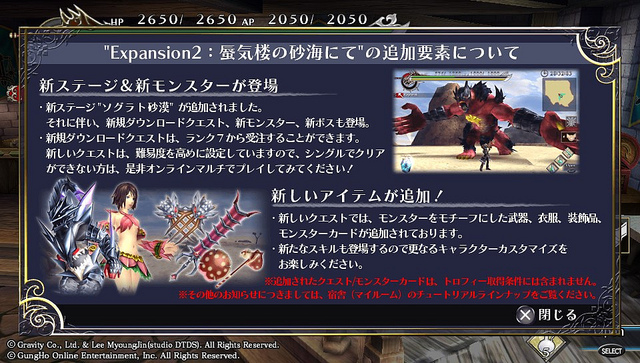 本日官方已釋出 Expansion2:Sograt Desert Update - 蜃気樓の砂海にて 的更新至 PS Store。玩家們可以先更新 Ragnarok Odyssey 的 LiveArea,然後按左上角黃色箭嘴圖示進行更新。下載完後關閉 Rangarok Odyssey 後再重新啟動 Ragnarok Odyssey 便可以自動安裝。