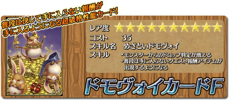 | 效果 | めざといドモヴォイ 眼光敏銳的杜莫伊 解放魔物的一部份掉落表及解放任務的一部份掉落表 ※估計可能是提升部份較難入手物品的掉落率 |